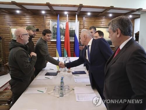 | ▲ 러시아 대표단과 우크라이나 대표단이 3일(현지시간) 벨라루스 벨라베슈 숲의 회담장에서 2차 평화회담을 개시하면서 악수하고 있다. |