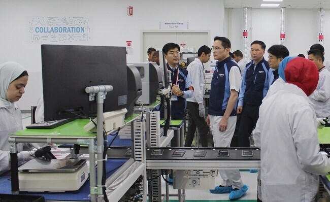 | ▲이재용 삼성전자 회장이 지난 1일(현지시간) 이집트 중부 베니수에프주에 위치한 삼성전자 TV·모바일 공장을 찾아 가동 현황을 점검하고 있다./사진=삼성전자 제공 |