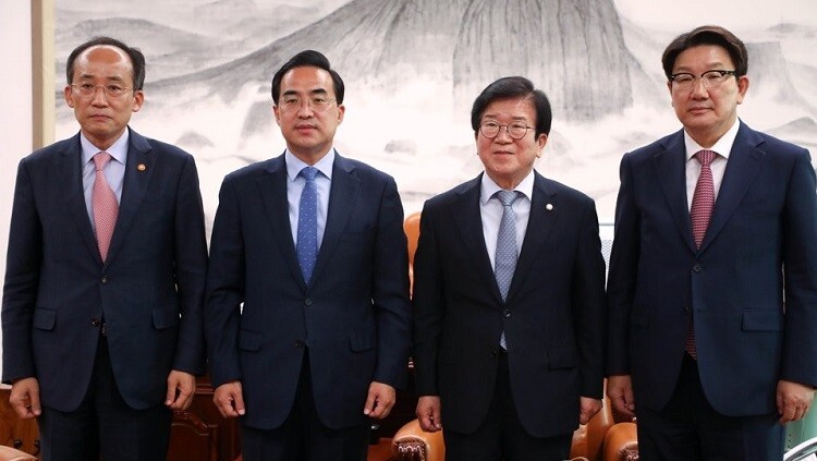 | ▲ 박병석 국회의장과 국민의힘 권성동 원내대표, 더불어민주당 박홍근 원내대표, 추경호 부총리 겸 기획재정부 장관이 29일 서울 여의도 국회 의장실에서 추경안 논의를 위해 회동을 하고 있다./사진=연합뉴스 제공 |