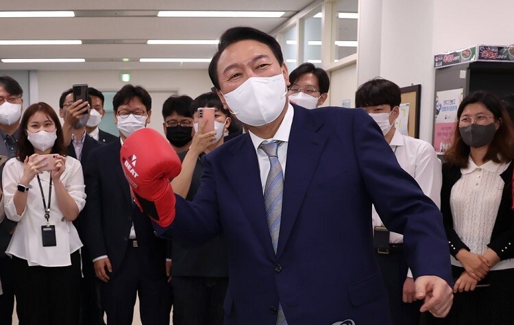 | ▲ 윤석열 대통령이 지난달 26일 세종시 정부세종청사에서 열린 국무회의를 마친 뒤 직원들을 격려하기 위해 사무실을 둘러보다 직원으로부터 선물받은 글러브를 끼고 '어퍼컷 세리머니'를 하고 있다./사진=연합뉴스 제공 |