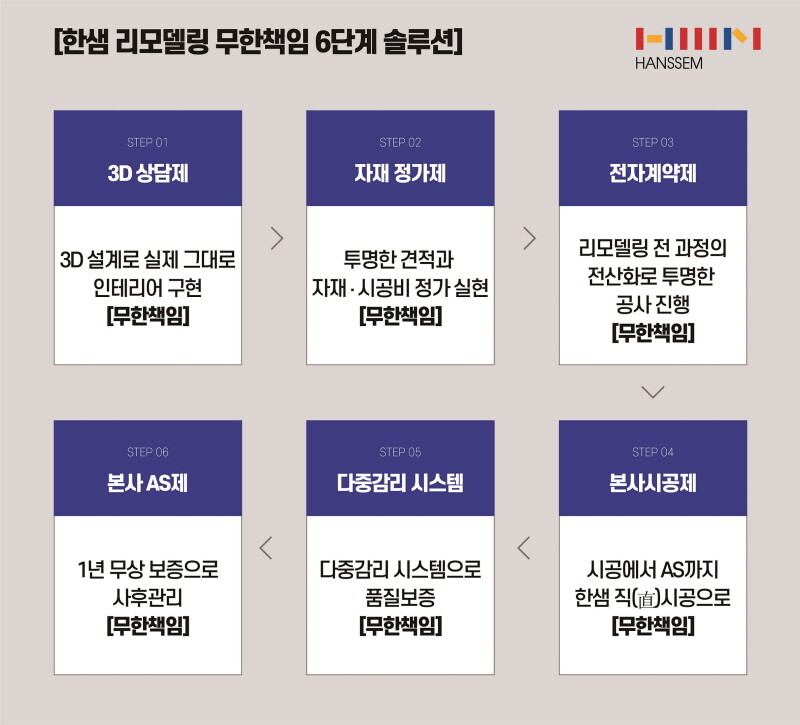 한샘의 전문성과 책임감을 담은 ▲3D 상담 ▲자재 정가제 ▲전자 계약 ▲직시공 ▲품질 보증 ▲본사 사후 서비스(AS) 등 6단계 책임 솔루션으로 리모델링 고객에게 새로운 경험을 제공한다는 계획이다.