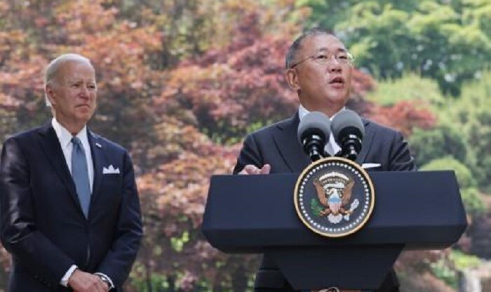바이든 대통령은 이 같은 내용을 발표하는 정 회장을 시종일관 미소를 지으며 바라봤다. 정 회장 다음으로 마이크를 넘겨받은 바이든 대통령은 친환경차, 배터리 등에 대한 미국 정부의 지원책을 언급한 후 미국에 대규모 투자를 해준 정 회장에게 감사를 표했다.