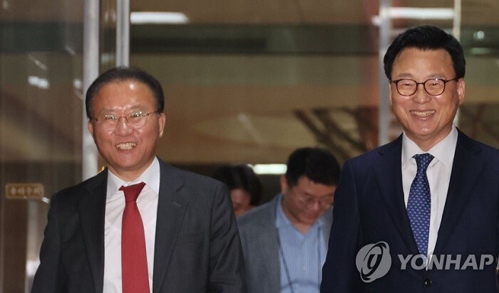 | ▲국민의힘 윤재옥 원내대표(왼쪽)와 더불어민주당 박광온 원내대표가 국회의장 주재 여야 원내대표 회동에 참석하기 위해 서울 여의도 국회 의장실로 향하고 있다./사진=연합뉴스 제공 |