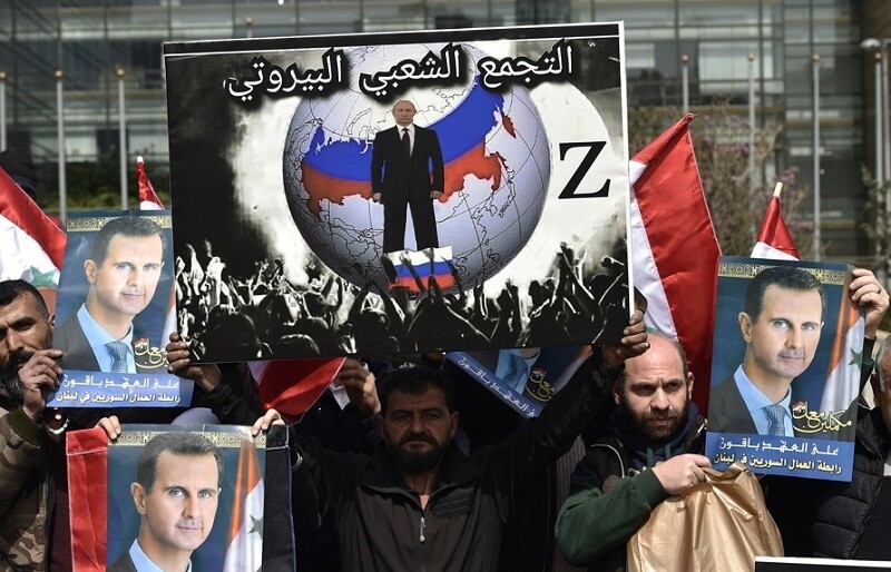 | ▲ 레바논 거주 시리아인 노동자들이 지난달 베이루트 도심의 유엔 기구 앞에서 블라디미르 푸틴 러시아 대통령과 바샤르 알 아사드 시리아 대통령의 초상을 들고 우크라이나 침공 지지 시위를 벌이고 있다./사진=연합뉴스 제공 |