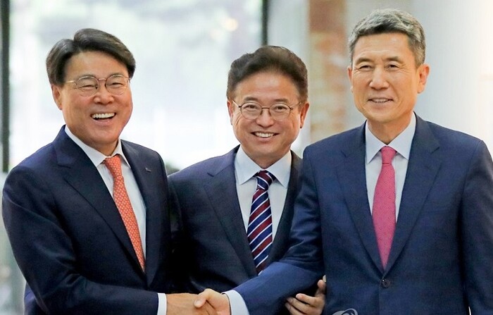 | ▲3일 경북 포항시 남구 괴동동 포스코 본사에서 열린 포스코 포항제철소 1기 설비 종합준공 50주년 기념행사에 참석하기에 앞서 최정우 포스코홀딩스 회장(왼쪽)과 이철우 경북도지사(가운데), 이강덕 포항시장(오른쪽)이 손을 잡고 있다./사진=연합뉴스 제공 |