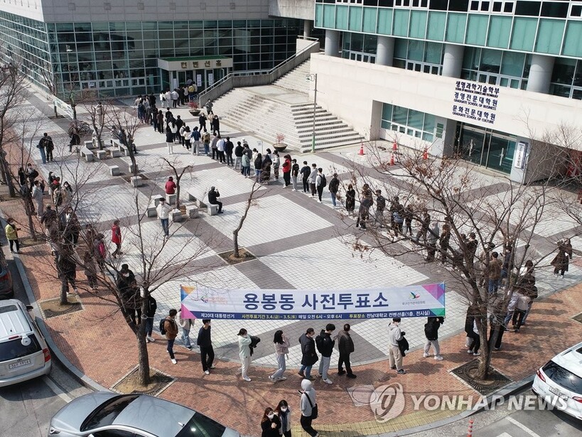 | ▲ 제20대 대통령선거 사전투표 첫날인 4일 오후 광주 북구 용봉동 사전투표소에서 유권자들이 몰려들면서 긴 대기 줄이 형성돼 있다./사진=연합뉴스 제공 |
