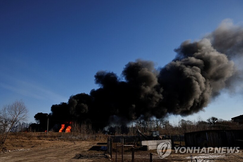 | ▲ 러시아군의 우크라이나 수도 키이우 총공세가 시작됐다는 보도가 나오는 가운데 키이우 외곽 바실키우 공군기지의 연료탱크에서 불길이 치솟고 있다./사진=연합뉴스 제공 |