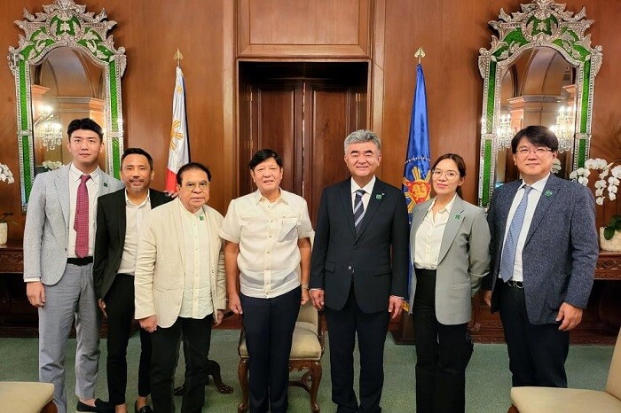 | ▲ 정원주 중흥그룹 부회장(오른쪽 세 번째)이 페르디난드 마르코스 필리핀 대통령(왼쪽 네 번째), 샤빗 싱손 LCS그룹 회장(왼쪽 세 번째), 리쉘 국회의원(오른쪽 두 번째)과 면담 후 기념 촬영을 하고 있다./사진=대우건설 제공 |