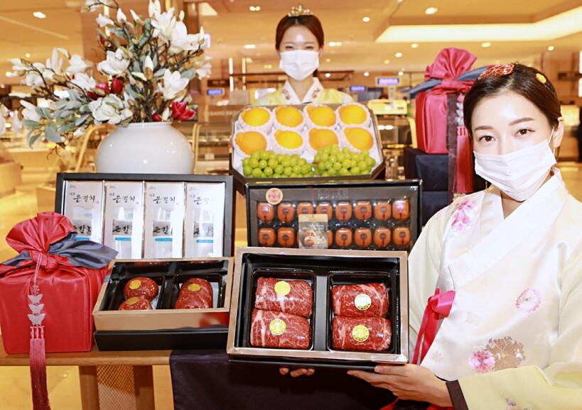 신세계백화점은 12일부터 내년 1월 2일까지 오프라인 전점과 온라인 SSG닷컴 신세계백화점몰(~14일까지, 온라인 전용 포함 7000여개 품목) 최대 60% 할인율을 적용, 설 선물 예약 판매 행사를 연다. 특히 신세계는 프리미엄 선물 수요에 초점을 두고 30만원 이상 상품을 지난 설 대비 30% 확대해 100여 가지를 준비했다. 샤인 머스캣 등 이색 과일 수요도 늘면서 청과 내 비중을 60%까지 늘리며 구성을 다양화했다.