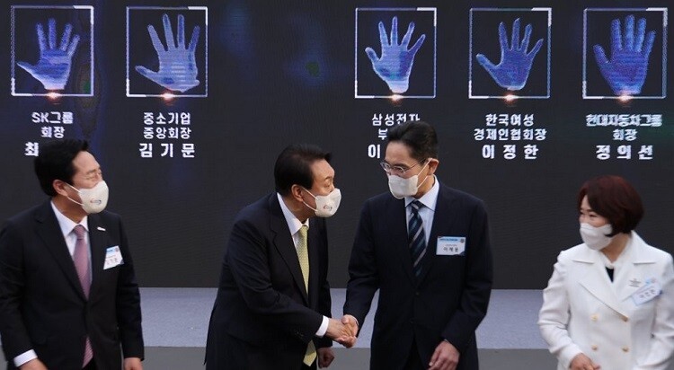 | ▲ 윤석열 대통령이 지난 5월 25일 서울 용산 대통령실 청사 앞 잔디마당에서 열린 2022 대한민국 중소기업인대회에서 대·중소기업 상생과 동반성장을 다짐하는 핸드프린팅이 끝난 뒤 이재용 삼성전자 부회장과 악수하고 있다./사진=연합뉴스 제공 |