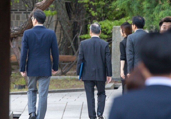 | ▲ 2019년 7월 4일 이재용 삼성전자 부회장과 손정의 일본 소프트뱅크 그룹 회장이 서울 성북구 한국가구박물관에서 만찬을 위해 이동하는 모습/사진=연합뉴스 제공 |