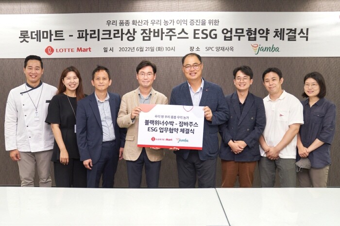 롯데마트(대표 강성현)는 지난 21일 잠바주스와 '상생 과일에 대한 사업 협력' MOU를 체결하고 이달 27일 롯데마트 K품종 프로젝트 대표 상품 '블랙위너수박' 잠바주스 신메뉴를 출시한다고 24일 밝혔다.