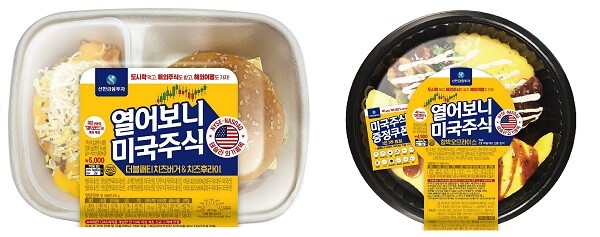 열어보니 미국주식 ‘더블패티치즈버거&치즈후라이’는 불고기 패티 2장이 들어간 치즈버거와 웨지감자로 구성됐고 ‘함박오므라이스’는 오므라이스, 함박스테이크, 야채볶음 등으로 푸짐하게 구성했다.