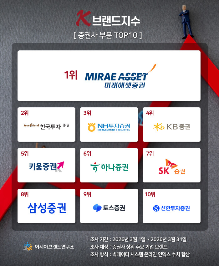 K-브랜드지수 증권사 부문은 1위 미래에셋증권에 이어 한국투자증권(2위), NH투자증권(3위), KB증권(4위), 키움증권(5위), 하나증권(6위), SK증권(7위), 삼성증권(8위), 토스증권(9위), 신한투자증권(10위) 등이 TOP10에 이름을 올렸다.
