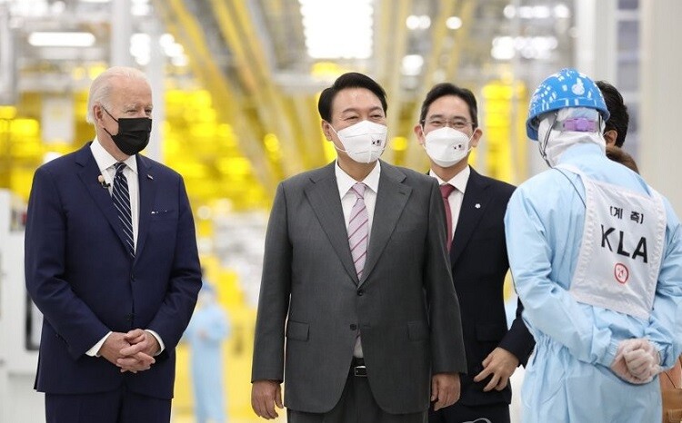 ▲ 취임 후 한국을 첫 방문한 조 바이든 미국 대통령이 윤석열 대통령과 20일 오후 경기도 평택시 삼성전자 반도체공장을 방문해 이재용 부회장의 안내를 받으며 공장을 시찰하고 있다./사진=연합뉴스 제공 |