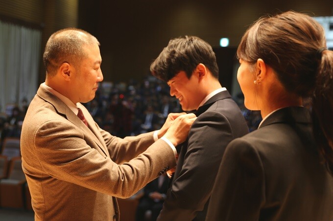 | ▲구자은 LS그룹 회장(좌)이 19일 안성시 LS미래원에서 2023년 LS 공채 신입사원들에게 회사 뱃지를 직접 달아주고 있다./사진=LS그룹 제공 |