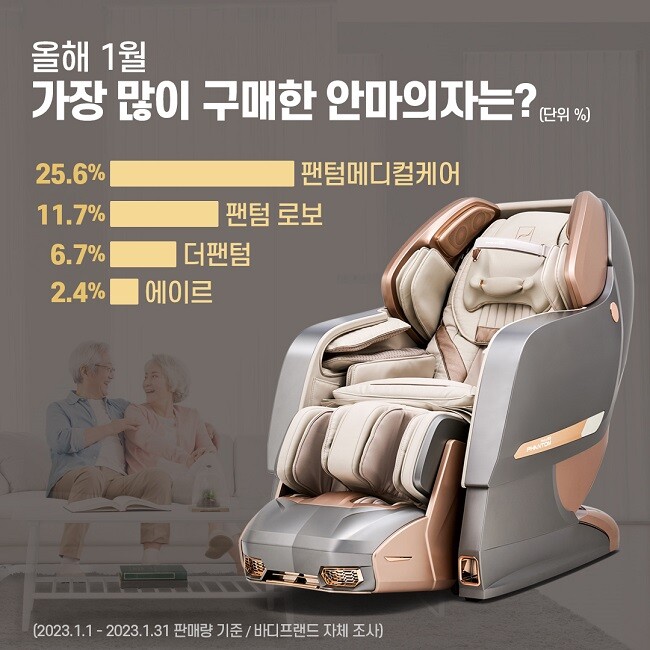 새해 첫 달 매출 1위의 주인공은 ‘팬텀 메디컬 케어’가 차지했다. 1월 중 바디프랜드 안마의자 및 의료기기를 렌탈, 구매한 고객 중 약 4분의 1인 25.6%가 팬텀 메디컬 케어를 선택했다.