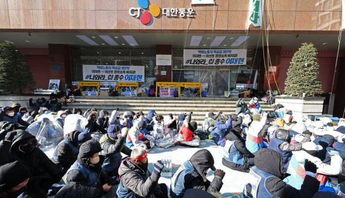| ▲과거 CJ대한통운 본사 앞 택배노조 조합원/사진=연합뉴스제공 |