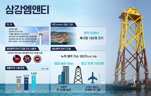 삼강엠앤티는 약 5000억원을 투자해 경남 고성에 160만㎡ 규모의 해상풍력 하부구조물 생산 공장 건설도 추진 중이다. 신규 공장은 연간 약 65만톤 수준의 해상풍력 하부구조물을 추가로 생산할 수 있다. 하부 구조물 생산능력으로는 세계 최대 규모다.
