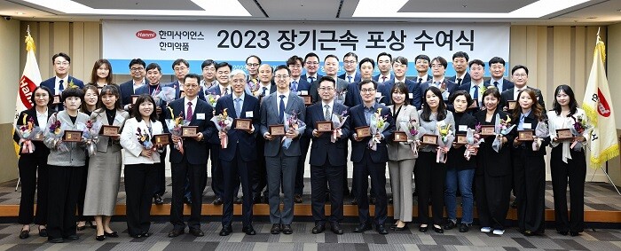 | ▲6일 한미사이언스·한미약품 ‘장기근속 포상 수여식’에서 임직원들이 기념촬영을 하고 있다. |