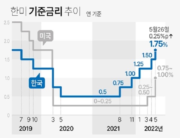 미국 연방준비제도(Fed·연준) 연방공개시장위원회(FOMC) 역시 6월과 7월 회의에서 기준금리를 0.50%포인트 인상하는 '빅스텝'을 단행할 가능성이 크다. 이렇게 되면 미국 기준금리는 현재 0.75~1% 수준에서 1.75~2% 수준에 도달하게 된다.