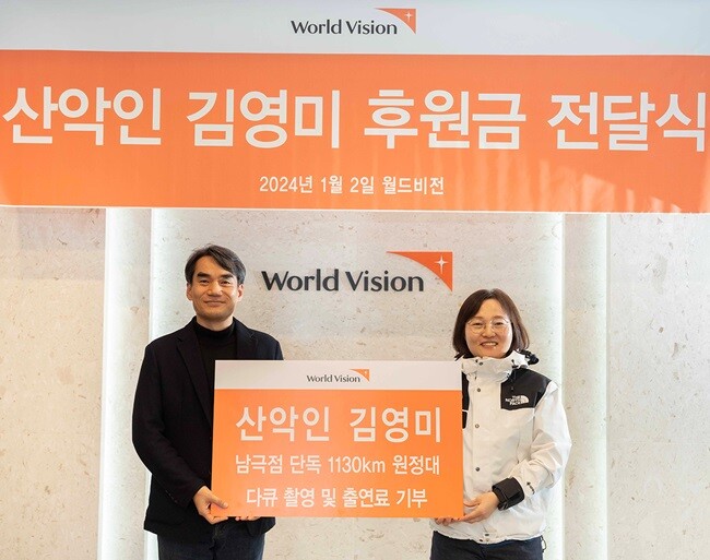 | ▲노스페이스 애슬리트팀 김영미 대장(좌측) 및 월드비전 ESG사회공헌본부 김성태 본부장(우측) |