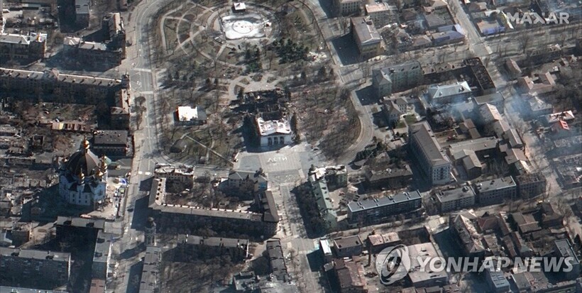 | ▲ 2022년 3월 19일 미국 민간위성업체 맥사가 공개한 마리우폴 극장의 위성사진./사진=연합뉴스 제공 |
