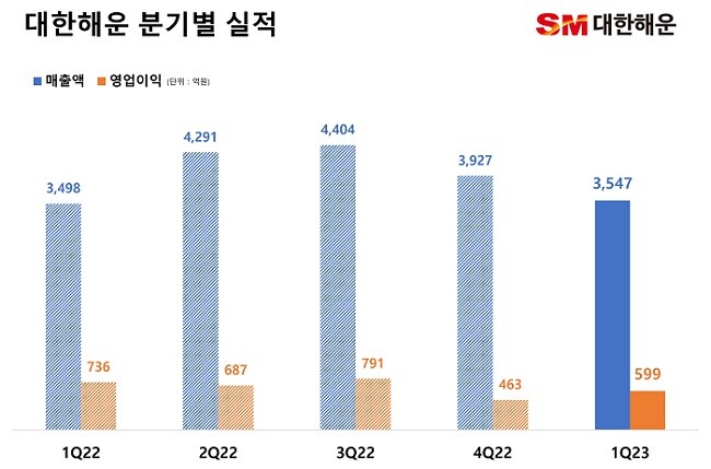 [소셜밸류=김완묵 기자] SM그룹(회장 우오현) 해운부문 계열사인 대한해운이 15일 공시를 통해 2023년 1분기 연결기준 매출액 3547억원, 영업이익 599억원을 기록했다고 발표했다. 매출액은 전년 동기 대비 1.4% 증가했지만 영업이익은 18.6% 감소한 수치다.