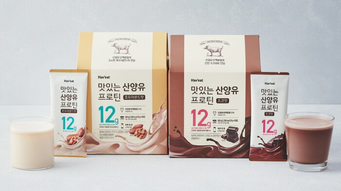 '맛있는 산양유 프로틴'은 롯데마트의 건강 기능 식품 자체 브랜드 '해빗(Hav'eat)' 신상품이다. 우유나 물에 타서 먹을 수 있는 파우더다. 1포에 달걀 2개 분량 단백질 12g을 함유했다. 고소한 풍미 '호두아몬드맛'과 달콤한 '초코맛'으로 단백질 특유 쓰고 비린 맛을 최소화했다.