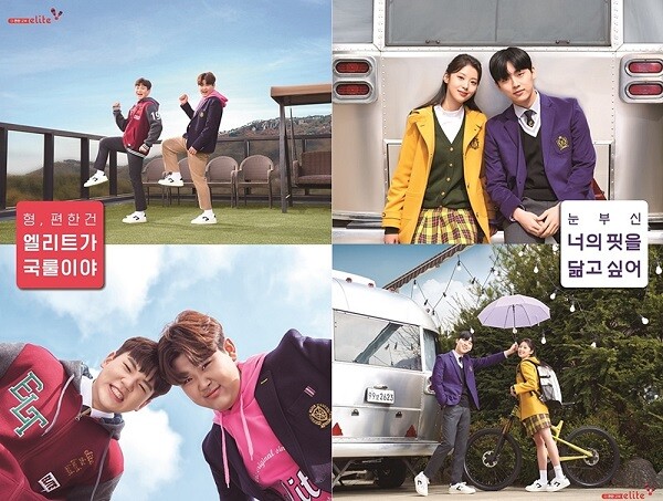 이번 포스터는 ‘편한 건 엘리트가 국룰이야’, ‘눈부신 너의 핏을 닮고 싶어’라는 문구와 함께 모델 4인의 모습을 담았다. 포스터 속 윤후와 이준수는 역동적인 포즈와 익살스러운 표정으로편안한 착용감을 강조했고 최현욱과 김다은은 다정한 분위기로 트렌디한 교복 스타일을 소화해냈다.