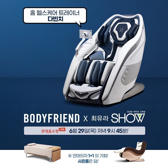 바디프랜드는 롯데홈쇼핑에서 가장 큰 팬덤을 형성하고 있는 간판 프로그램 ‘최유라쇼’에서 신제품 홈 헬스케어 트레이너 안마의자 ‘다빈치’를 선보인다. ‘최유라쇼’의 메인 타임인 21시 45분에 시작되는 본 방송은 전 TV홈쇼핑 중 단독 론칭하는 방송인 만큼 다양한 혜택을 마련했다.