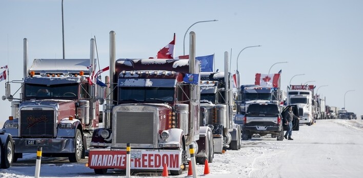 | ▲캐나다 앨버타주 쿠츠에서 미국과의 국경을 막았던 트럭시위대/사진=연합뉴스 제공 |