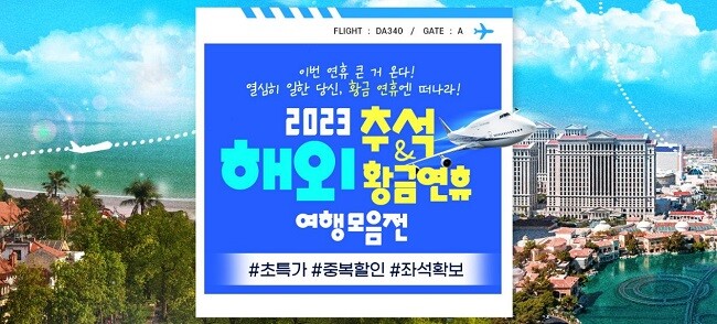 같은 기간 ‘추석&황금연휴 해외여행 모음전’도 이어진다. 중단거리부터 장거리까지 인기 여행지별 상품을 추천하고, 최대 20% 중복 할인 혜택을 전한다. 최대 15% 즉시 할인을 기본으로, 5% 전용 할인 쿠폰도 선착순으로 발급한다.