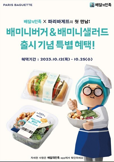 또한 제품 출시일인 오는 12일부터는 배달의민족 앱에서 △신제품 2종에 한해 500원 즉시 혜택 쿠폰 △배달비 무료혜택 △배민1 최대 6천원 쿠폰 제공 등의 이벤트를 진행한다. 또한 파리바게뜨 ‘배미니’ 제품 구매 고객 대상 배달의민족에서 사용할 수 있는 파리바게뜨 상품권(5천원)을 총 100명에게 랜덤 추첨 증정하는 이벤트도 마련했다고 전했다.