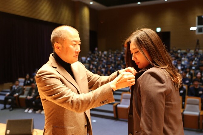 | ▲구자은 LS그룹 회장(좌)이 18일 LS미래원에서 2024년 LS 공채 신입사원들에게 회사 배지를 직접 달아주고 있다. |