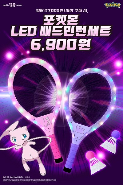 배스킨라빈스는 굿즈 출시를 기념해 오는 11일까지 ‘사전 예약 프로모션’을 실시한다. 해피오더 애플리케이션과 카카오톡 주문하기를 통해 아이스크림 쿼터 사이즈 이상 사전 예약 시 1천원의 혜택을 적용해 ‘포켓몬 LED 배드민턴 세트’를 5천원 대에 판매한다.