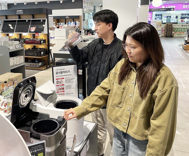 | ▲전자랜드 파워센터 용산본점에서 고객들이 음식물처리기를 살펴보고 있다./사진=전자랜드 제공 |