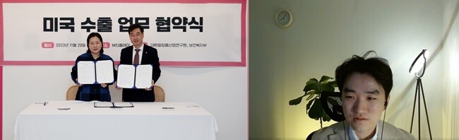 | ▲업무협약식에서 (오른쪽)NS홈쇼핑 고객지원본부 김갑종 전무, (왼쪽)제이준코스메틱㈜ 하지연 이사, 영상회의 영상 캡쳐 파인드랙 채준 COO/사진=NS홈쇼핑 제공 |
