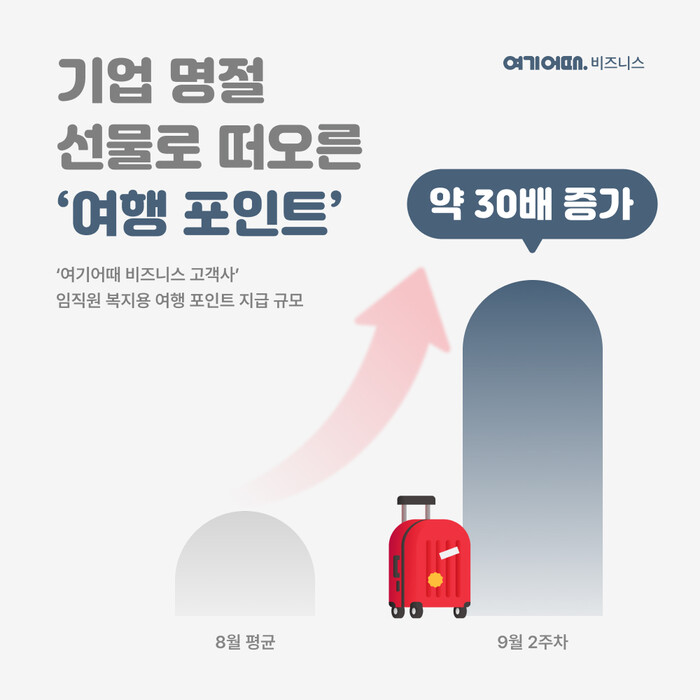여기어때(대표 정명훈)가 기업 대상 복지 포인트 판매 데이터를 분석한 결과, 추석을 앞두고 기업의 여행 포인트 지급액이 지난달 평균에 비해 이달 2주차의 여행 포인트 지급액이 약 30배 늘었다고 21일 밝혔다.