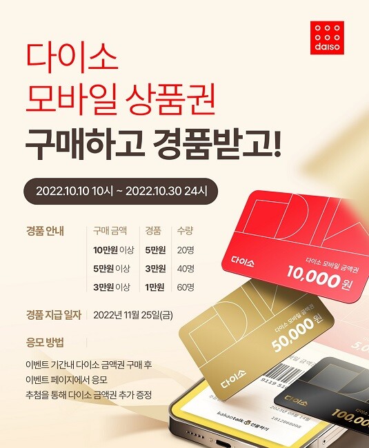 | ▲아성다이소가 카카오톡 선물하기에서 ‘다이소 모바일 상품권 이벤트’를 진행한다./사진=아성다이소 제공 |