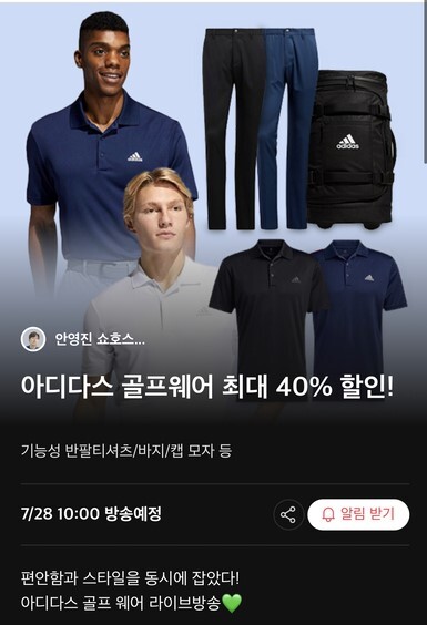 28일 아디다스 골프 의류, 모자 등 액세서리 라방에 이어 29일엔 핑 골프채, 미즈노 골프백 등 골프 용품을 라이브 커머스 방송에서만 40%까지 할인 판매할 예정이다.