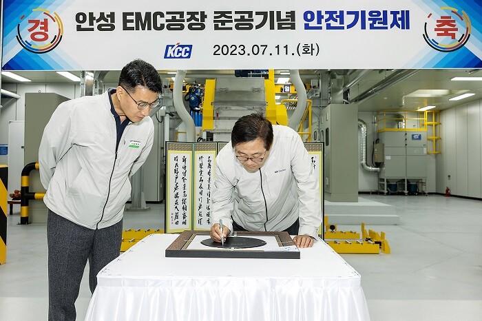 지난 11일 KCC는 경기도 안성시 서운면에 위치한 KCC안성공장에 EMC 생산라인을 신설하고 무사고 무재해를 기원하는 안전기원제를 가졌다고 12일 밝혔다. 이날 행사에는 KCC 정몽진 회장, 정재훈 사장을 비롯한 협력업체 및 관계자 50여 명이 참석했으며, 반도체 웨이퍼에 사인 세리머니 행사도 함께 진행했다.