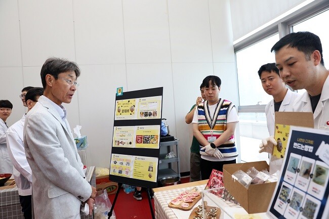 | ▲농심 신동원 회장이 사내 아이디어공모전 '챌린지페어'에서 연구원들의 신제품 아이디어를 듣고 있다./사진=농심 제공 |