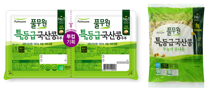| ▲풀무원식품의 특등급 국산콩 두부와 특등급 국산콩 무농약 콩나물 제품 이미지/사진=풀무원식품 제공 |