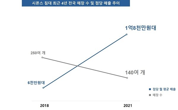 | ▲시몬스 침대의 최근 4년간 전국 매장 수 및 점당 매출 추이/사진=시몬스 침대 제공 |
