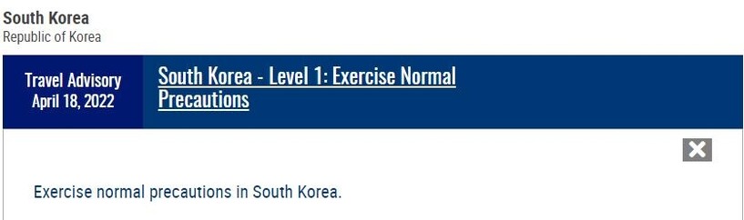 이에 한국 여행 경보 수준은 1단계 일반적 사전 주의에 해당된다.