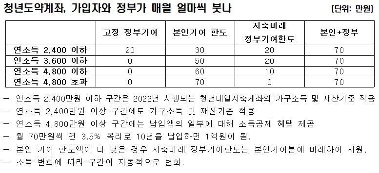 연소득 2천400만원 이하는 가입자가 매월 최대 30만원을 저축하면, 고정적인 정부기여금 20만원에 저축 비례 정부기여한도 최대 20만원을 더해 최대 70만원을 납입할 수 있다. 또 연소득이 2천400만∼3천600만원이라면 가입자는 매월 최대 50만원을 저축할 수 있고, 저축 비례 정부기여한도 최대 20만원을 더해 최대 70만원을 납입한다.