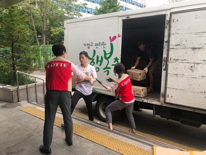 롯데백화점과 롯데마트, 롯데홈쇼핑 세븐일레븐 등 롯데 유통 사업부와 계열사로 구성된 롯데 유통군은 2018년부터 행정안전부, 전국재해구호협회 희망브리지와 '재난 긴급 구호 민관 협력 업무 협약'을 체결, 지원 활동을 펼치고 있다.
