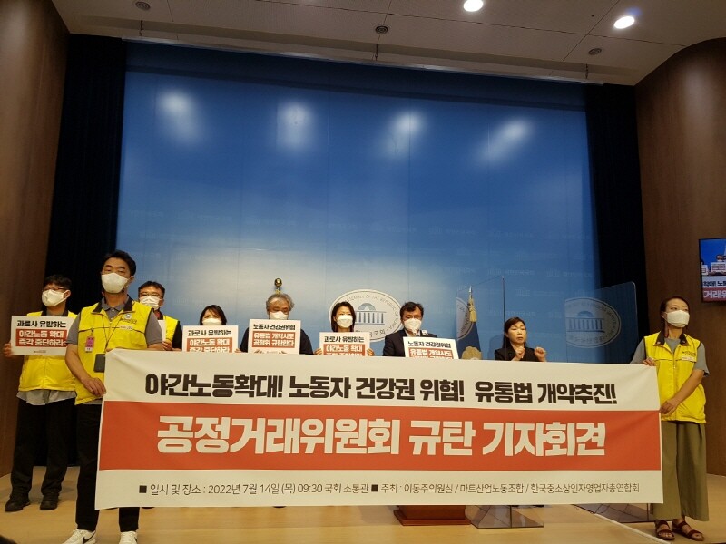 14일 이동주 더불어민주당 국회의원과 마트산업노동조합, 한국중소상인자영업자총연합회는 국회 소통관에서 기자 회견을 열고 공정거래위원회가 유통법 개악을 시도한다며 규탄했다.
