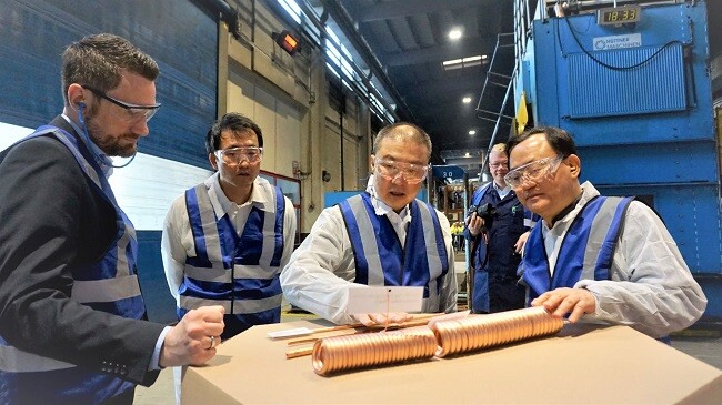 | ▲구자은 LS그룹 회장이 독일 L&K 공장을 방문해 영업 담당 직원으로부터 핵심 제품인 무산소동봉(Oxygen Free Copper Rod)에 대한 설명을 듣고 있다./사진=LS그룹 제공 |
